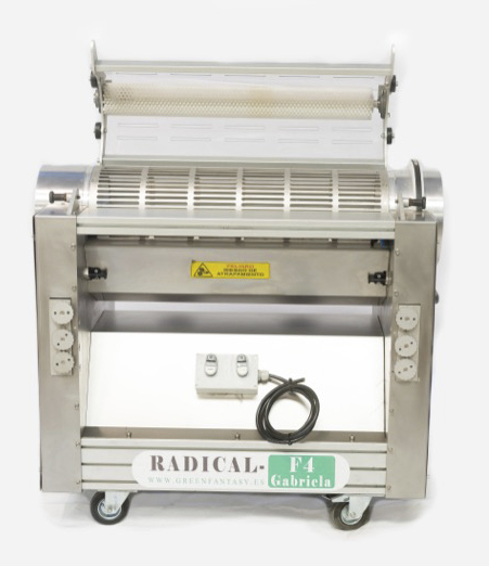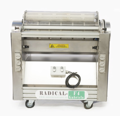 Radical f4 Gabriela tiene un tamaño grande e industrial, es pesada, pero se puede trasladar fácilmente de cultivo a cultivo ya que consta de ruedas, tanto la maquina como el conjunto de extracción.